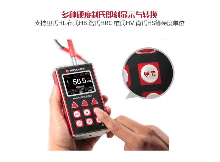 單位制式 | 里氏(HL)、布氏(HB)、洛氏B(HRB)、洛氏C(HRC)、洛氏A(HRA)、維氏(HV)、肖氏(HS) |