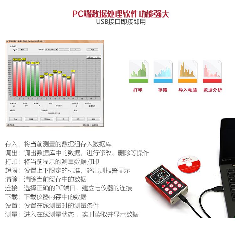 配備PC端數(shù)據(jù)處理軟件,具有傳輸測量結(jié)果、存儲管理、統(tǒng)計分析、生成測量報告等豐富功能。