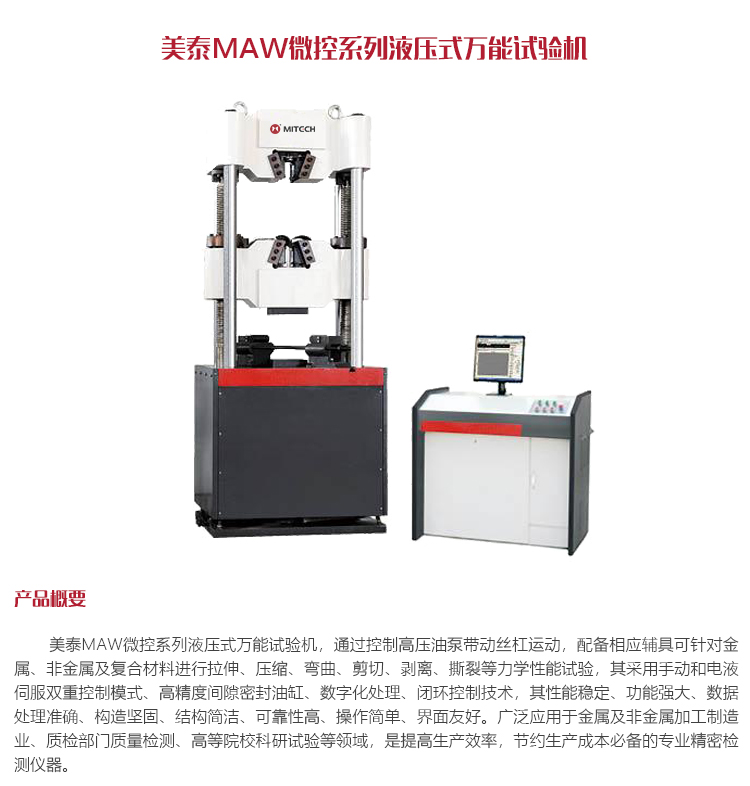 美泰MAW微控系列液壓式萬能試驗機(jī),通過控制高壓油泵帶動絲杠運動,配備相應(yīng)輔具可針對金屬、非金屬及復(fù)合材料進(jìn)行拉伸、壓縮、彎曲、剪切、剝離、撕裂等力學(xué)性能試驗,其采用手動和電液伺服雙重控制模式、高精度間隙密封油缸、數(shù)字化處理、閉環(huán)控制技術(shù),其性能穩(wěn)定、功能強(qiáng)大、數(shù)據(jù)處理準(zhǔn)確、構(gòu)造堅固、結(jié)構(gòu)簡潔、可靠性高、操作簡單、界面友好。廣泛應(yīng)用于金屬及非金屬加工制造業(yè)、質(zhì)檢部門質(zhì)量檢測、高等院??蒲性囼灥阮I(lǐng)域,是提高生產(chǎn)效率,節(jié)約生產(chǎn)成本必備的專業(yè)精密檢測儀器。