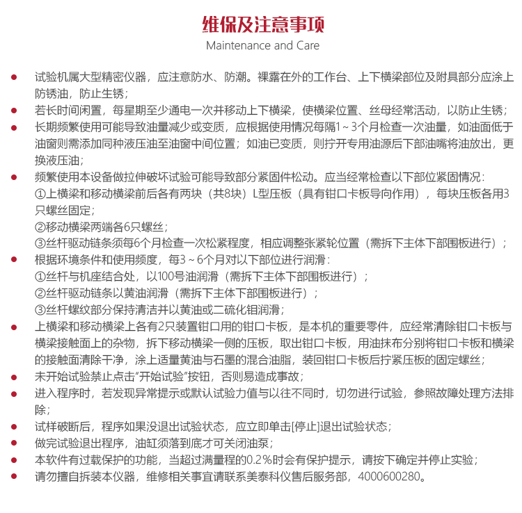 試驗機(jī)屬大型精密儀器,應(yīng)注意防水、防潮。裸露在外的工作臺、上下橫梁部位及附具部分應(yīng)涂上防銹油,防止生銹;