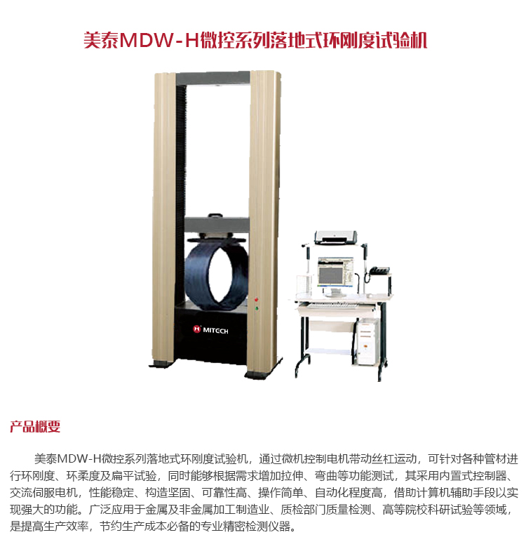 美泰MDW-H微控系列落地式環(huán)剛度試驗(yàn)機(jī),通過(guò)微機(jī)控制電機(jī)帶動(dòng)絲杠運(yùn)動(dòng),可針對(duì)各種管材進(jìn)行環(huán)剛度、環(huán)柔度及扁平試驗(yàn),同時(shí)能夠根據(jù)需求增加拉伸、彎曲等功能測(cè)試,其采用內(nèi)置式控制器、交流伺服電機(jī),性能穩(wěn)定、構(gòu)造堅(jiān)固、可靠性高、操作簡(jiǎn)單、自動(dòng)化程度高,借助計(jì)算機(jī)輔助手段以實(shí)現(xiàn)強(qiáng)大的功能。廣泛應(yīng)用于金屬及非金屬加工制造業(yè)、質(zhì)檢部門(mén)質(zhì)量檢測(cè)、高等院校科研試驗(yàn)等領(lǐng)域,是提高生產(chǎn)效率,節(jié)約生產(chǎn)成本必備的專(zhuān)業(yè)精密檢測(cè)儀器。
