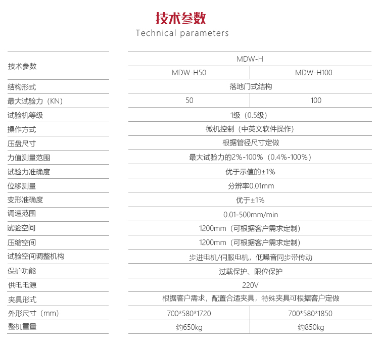 采用臺(tái)式單臂雙空間結(jié)構(gòu)來(lái)實(shí)現(xiàn)拉壓,橫梁升降可無(wú)級(jí)調(diào)速;