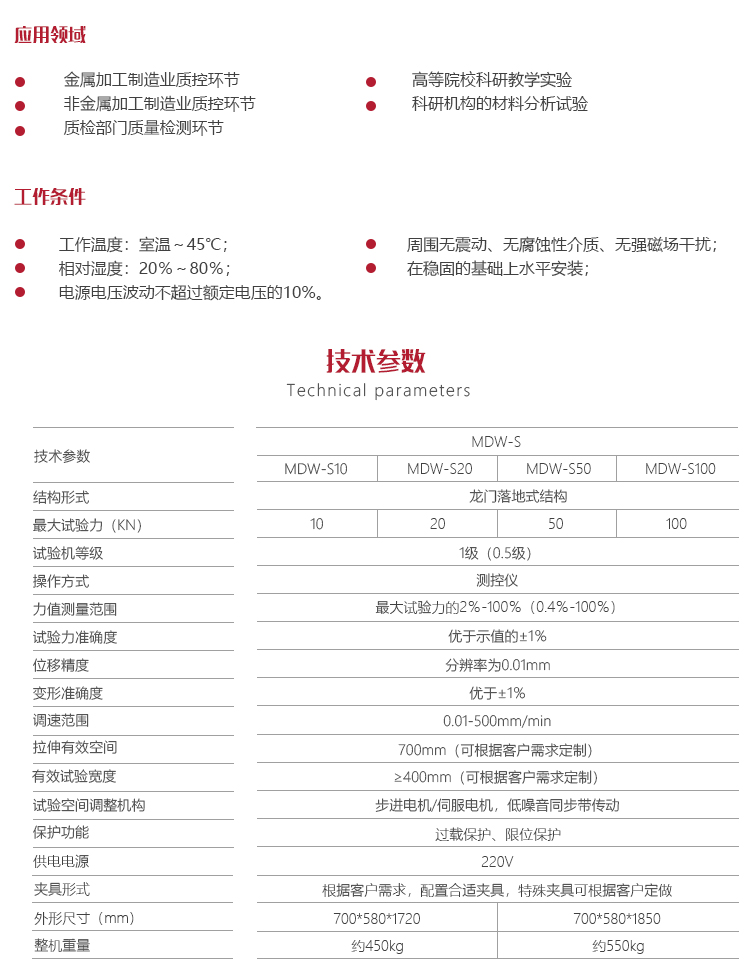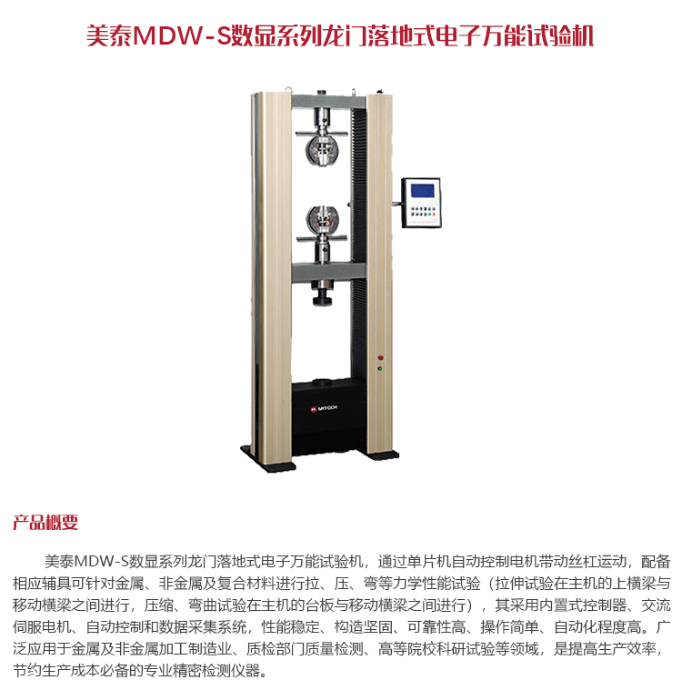 美泰MDW-S數(shù)顯系列龍門落地式電子萬能試驗機,通過單片機自動控制電機帶動絲杠運動,配備相應輔具可針對金屬、非金屬及復合材料進行拉、壓、彎等力學性能試驗(拉伸試驗在主機的上橫梁與移動橫梁之間進行,壓縮、彎曲試驗在主機的臺板與移動橫梁之間進行),其采用內(nèi)置式控制器、交流伺服電機、自動控制和數(shù)據(jù)采集系統(tǒng),性能穩(wěn)定、構(gòu)造堅固、可靠性高、操作簡單、自動化程度高。廣泛應用于金屬及非金屬加工制造業(yè)、質(zhì)檢部門質(zhì)量檢測、高等院??蒲性囼灥阮I(lǐng)域,是提高生產(chǎn)效率,節(jié)約生產(chǎn)成本必備的專業(yè)精密檢測儀器。