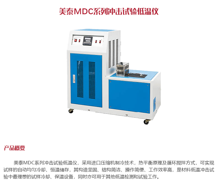 美泰MDC系列沖擊試驗(yàn)低溫儀,采用進(jìn)口壓縮機(jī)制冷技術(shù),熱平衡原理及循環(huán)攪拌方式,可實(shí)現(xiàn)試樣的自動(dòng)均勻冷卻、恒溫儲(chǔ)存,其構(gòu)造堅(jiān)固、結(jié)構(gòu)簡(jiǎn)潔、操作簡(jiǎn)便、工作效率高,是材料低溫沖擊試驗(yàn)中最理想的試樣冷卻、保溫設(shè)備,同時(shí)亦可用于其他低溫檢測(cè)和試驗(yàn)工作。