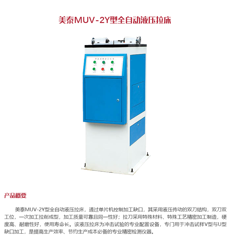 美泰MUV-2Y型全自動液壓拉床,通過單片機控制加工缺口,其采用液壓傳動的雙刀結(jié)構(gòu),雙刀雙工位,一次加工拉削成型,加工質(zhì)量可靠且同一性好;拉刀采用特殊材料、特殊工藝精密加工制造,硬度高、耐磨性好,使用壽命長。該液壓拉床為沖擊試驗的專業(yè)配置設(shè)備,專門用于沖擊試樣V型與U型缺口加工,是提高生產(chǎn)效率、節(jié)約生產(chǎn)成本必備的專業(yè)精密檢測儀器。