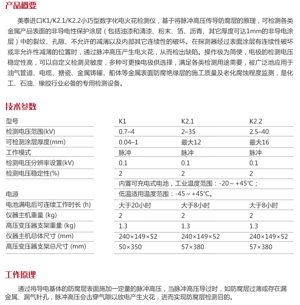 美泰進(jìn)口K1/K2.1/K2.2小巧型數(shù)字化電火花檢測(cè)儀,基于將脈沖高壓傳導(dǎo)防腐層的原理,可檢測(cè)各類金屬產(chǎn)品表面的非導(dǎo)電性保護(hù)涂層(包括油漆和清漆、粉末、箔、瀝青、其它厚度可達(dá)1mm的非導(dǎo)電涂層)中的裂紋、孔隙、不允許的減薄以及內(nèi)部其它連續(xù)性的破壞。在探測(cè)器經(jīng)過表面涂層有連續(xù)性破壞或非允許性減薄的位置時(shí),通過脈沖高壓產(chǎn)生電火花,從而檢出缺陷。操作極為簡(jiǎn)便,電極的檢測(cè)電壓穩(wěn)定性高,可以自定義檢測(cè)靈敏度,多種可更換電極供選擇,滿足各類檢測(cè)用途需要,被廣泛地應(yīng)用于油氣管道、電纜、搪瓷、金屬鑄罐、船體等金屬表面防腐絕緣層的施工質(zhì)量及老化腐蝕程度監(jiān)測(cè),是化工、石油、橡膠行業(yè)必備的專用檢測(cè)設(shè)備。