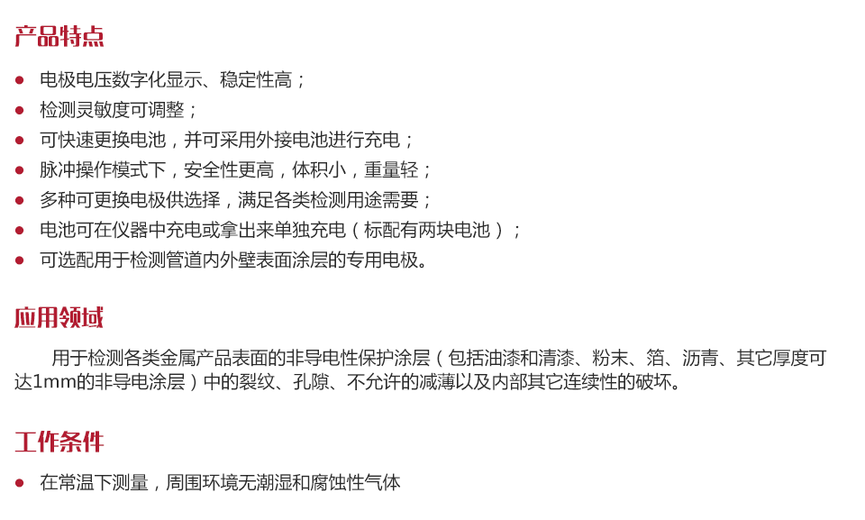 用于檢測(cè)各類金屬產(chǎn)品表面的非導(dǎo)電性保護(hù)涂層(包括油漆和清漆、粉末、箔、瀝青、其它厚度可達(dá)1mm的非導(dǎo)電涂層)中的裂紋、孔隙、不允許的減薄以及內(nèi)部其它連續(xù)性的破壞。