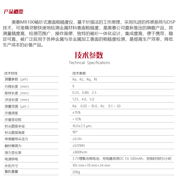 美泰MR100袖珍式表面粗糙度儀,基于針描法的工作原理,采用先進(jìn)的傳感系統(tǒng)與DSP技術(shù),可準(zhǔn)確靈敏快速地檢測(cè)金屬材料表面粗糙度,是美泰公司為檢測(cè)粗糙度研發(fā)的最新袖珍產(chǎn)品,其具有測(cè)量精度高、測(cè)量范圍廣、操作簡(jiǎn)便、便于攜帶、工作穩(wěn)定等特點(diǎn),被廣泛應(yīng)用于各種金屬與非金屬加工表面的檢測(cè),是提高生產(chǎn)效率,降低生產(chǎn)成本的必備產(chǎn)品。