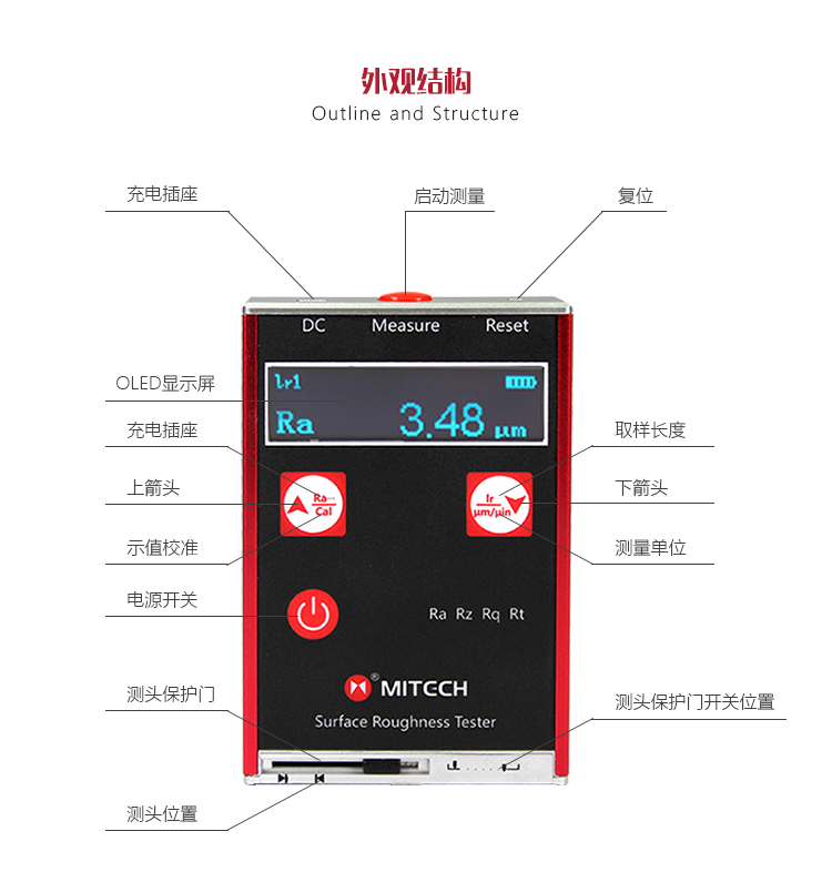 本儀器具有米制和英制兩種單位,可長(zhǎng)按取樣長(zhǎng)度鍵進(jìn)行轉(zhuǎn)換。