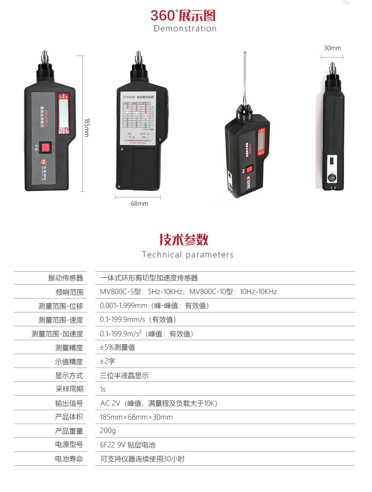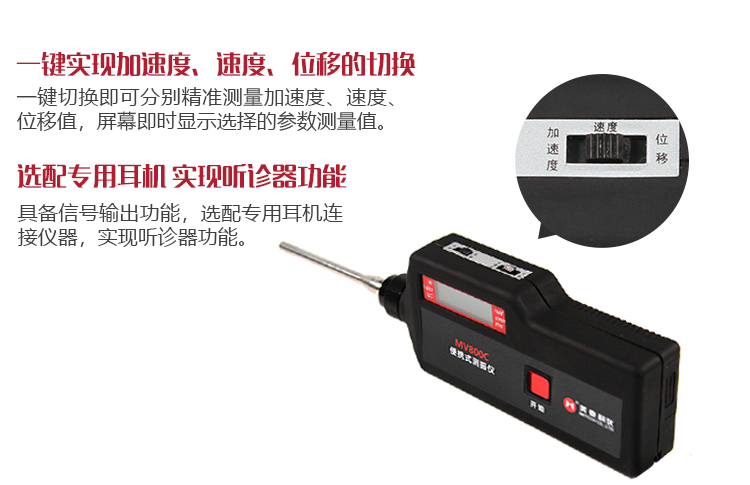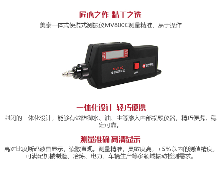 美泰袖珍一體化測(cè)振儀MV800C系列是由壓電式傳感器和數(shù)字顯示電路組成的手持式測(cè)振儀表,主要用于測(cè)量各種旋轉(zhuǎn)機(jī)械的振動(dòng)加速度、速度和位移。MV800C系列分兩種型號(hào)MV800C-5(頻響范圍:5Hz~10KHz)和MV800C-10(頻響范圍:10Hz~10KH),可滿足常規(guī)測(cè)振使用需求以及低頻振動(dòng)測(cè)量需求。該產(chǎn)品測(cè)量范圍廣,顯示直觀、一體化的設(shè)計(jì)體積小、重量輕,測(cè)量攜帶方便,特別適用于野外無電源的現(xiàn)場(chǎng)作業(yè)及高空作業(yè),大大減少工作人員的工作強(qiáng)度,提高工作效率。