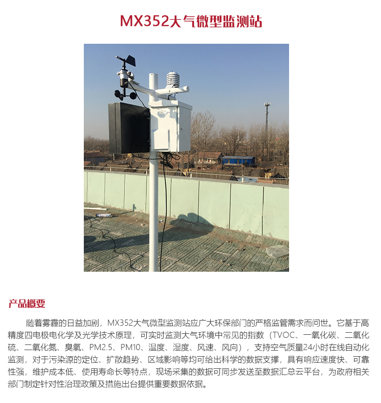 隨著霧霾的日益加劇,MX352大氣微型監(jiān)測站應(yīng)廣大環(huán)保部門的嚴格監(jiān)管需求而問世。它基于高精度四電極電化學及光學技術(shù)原理,可實時監(jiān)測大氣環(huán)境中常見的指數(shù)(TVOC、一氧化碳、二氧化硫、二氧化氮、臭氧、PM2.5、PM10、溫度、濕度、風速、風向),支持空氣質(zhì)量24小時在線自動化監(jiān)測,對于污染源的定位、擴散趨勢、區(qū)域影響等均可給出科學的數(shù)據(jù)支撐,具有響應(yīng)速度快、可靠性強,維護成本低、使用壽命長等特點,現(xiàn)場采集的數(shù)據(jù)可同步發(fā)送至數(shù)據(jù)匯總云平臺,為政府相關(guān)部門制定針對性治理政策及措施出臺提供重要數(shù)據(jù)依據(jù)。