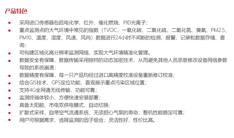 l 重點監(jiān)測點的大氣環(huán)境中常見的指數(shù)(TVOC、一氧化碳、二氧化硫、二氧化氮、臭氧、PM2.5、PM10、溫度、濕度、風速、風向)數(shù)據(jù)進行24小時不間斷的檢測、報警、記錄和數(shù)據(jù)存儲、查詢;