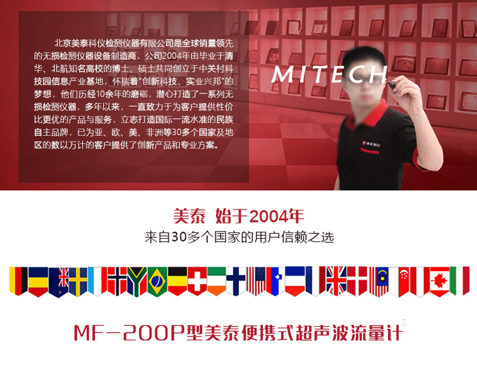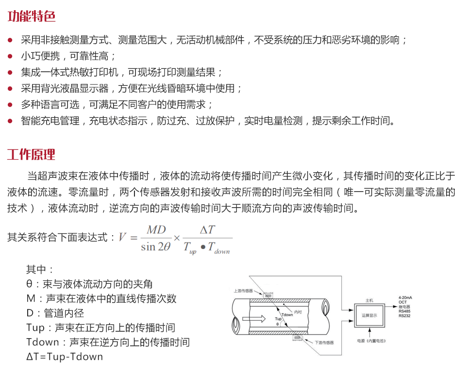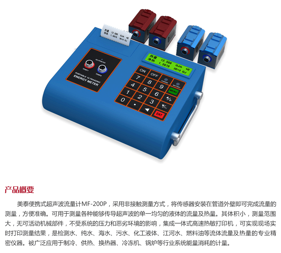 美泰便攜式超聲波流量計MF-200P,采用非接觸測量方式,將傳感器安裝在管道外壁即可完成流量的測量,方便準確??捎糜跍y量各種能夠傳導超聲波的單一均勻的液體的流量及熱量。其體積小,測量范圍大,無可活動機械部件,不受系統(tǒng)的壓力和惡劣環(huán)境的影響,集成一體式高速熱敏打印機,可實現(xiàn)現(xiàn)場實時打印測量結(jié)果,是檢測水、純水、海水、污水、化工液體、江河水、燃料油等流體流量及熱量的專業(yè)精密儀器。被廣泛應用于制冷、供熱、換熱器、冷凍機、鍋爐等行業(yè)系統(tǒng)能量消耗的計量。