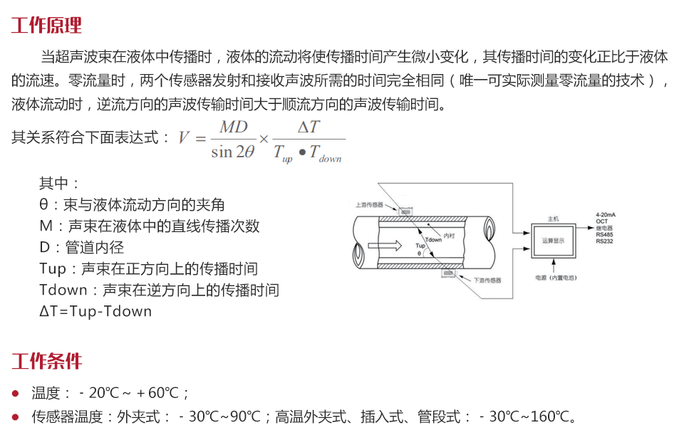 當(dāng)超聲波束在液體中傳播時,液體的流動將使傳播時間產(chǎn)生微小變化,其傳播時間的變化正比于液體的流速。零流量時,兩個傳感器發(fā)射和接收聲波所需的時間完全相同(唯一可實際測量零流量的技術(shù)),液體流動時,逆流方向的聲波傳輸時間大于順流方向的聲波傳輸時間。