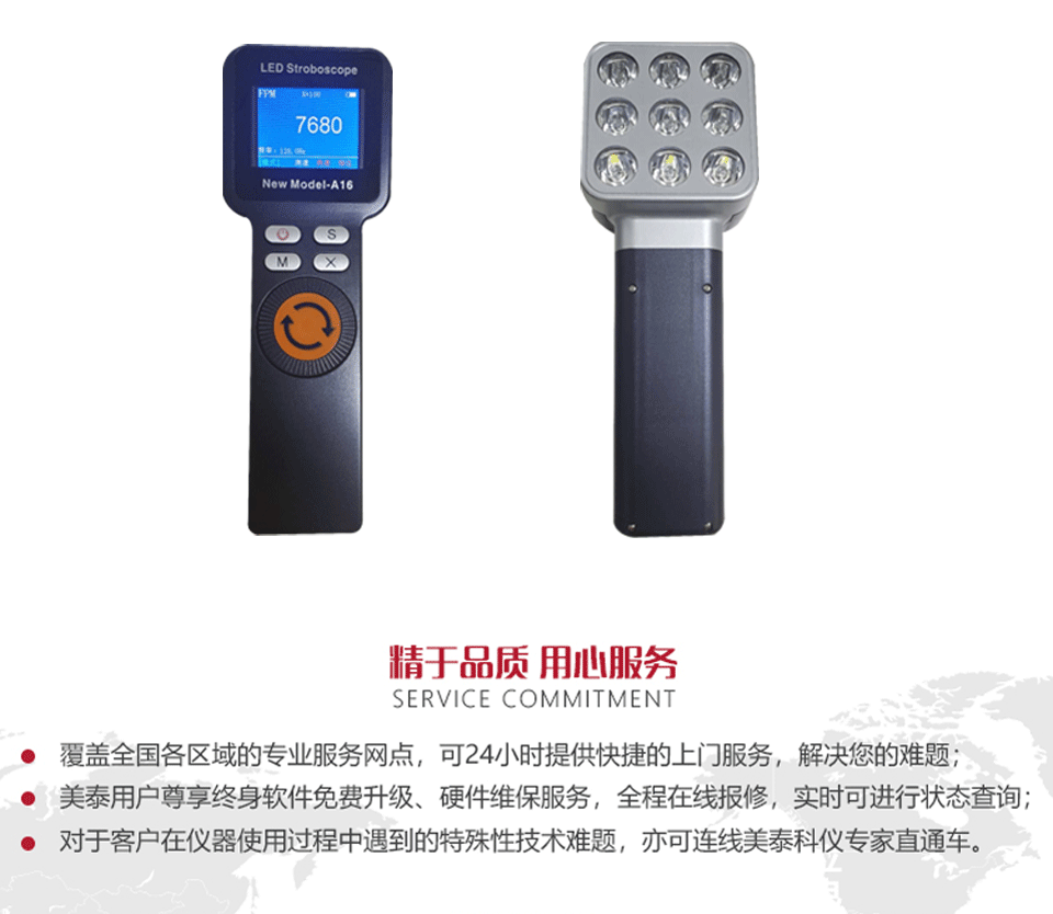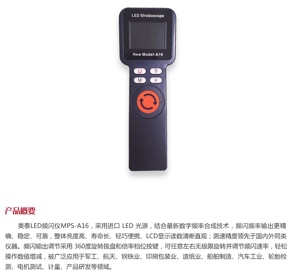美泰LED頻閃儀MPS-A16,采用進口 LED 光源,結合最新數(shù)字頻率合成技術,頻閃頻率輸出更精確、穩(wěn)定、可靠,整體亮度高、壽命長、輕巧便攜、LCD顯示讀數(shù)清晰直觀;測速精度領先于國內外同類儀器。頻閃輸出調節(jié)采用 360 度旋轉撥盤和倍率檔位按鍵,可任意左右無極限旋轉并調節(jié)頻閃速率,輕松操作數(shù)值增減,被廣泛應用于軍工、航天、鋼鐵業(yè)、印刷包裝業(yè)、造紙業(yè)、船舶制造、汽車工業(yè)、輪胎檢測、電機測試、計量、產品研發(fā)等領域。