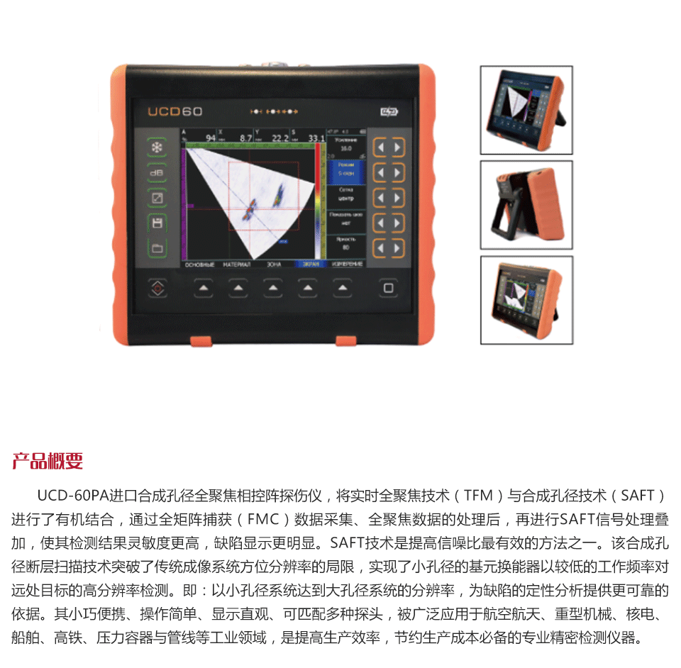 進口UCD-60合成孔徑全聚焦相控陣檢測儀,實現全聚焦技術(TFM)與合成孔徑技術(SAFT)有機結合,合成孔徑斷層掃描技術方法突破了傳統成像系統方位分辨率的概念,實現了以小孔徑系統達到大孔徑系統的分辨率,檢測結果靈敏度更高,缺陷顯示更加明顯,為缺陷的定性分析提供更可靠的依據。其小巧便攜、操作簡單、顯示直觀、可匹配多種傳感器,廣泛應用于航空航天、重型機械、核電、船舶、高鐵、壓力容器與管線等工業(yè)領域,是提高生產效率,節(jié)約生產成本必備的專業(yè)精密檢測儀器。