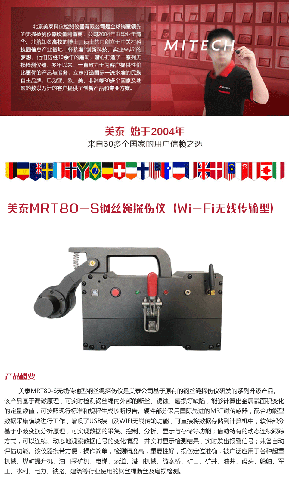 美泰MRT80-S無線傳輸型鋼絲繩探傷儀是美泰公司基于原有的鋼絲繩探傷儀研發(fā)的系列升級產(chǎn)品。該產(chǎn)品基于漏磁原理,可實時檢測鋼絲繩內(nèi)外部的斷絲、銹蝕、磨損等缺陷,能夠計算出金屬截面積變化的定量數(shù)值,可按照現(xiàn)行標準和規(guī)程生成診斷報告。硬件部分采用國際先進的MRT磁傳感器,配合功能型數(shù)據(jù)采集模塊進行工作,增設了USB接口及WIFI無線傳輸功能,可直接將數(shù)據(jù)存儲到計算機中;軟件部分基于小波變換分析原理,可實現(xiàn)數(shù)據(jù)的采集、控制、分析、顯示與存儲等功能;借助特有的動態(tài)連續(xù)跟蹤方式,可以連續(xù)、動態(tài)地觀察數(shù)據(jù)信號的變化情況,并實時顯示檢測結果,實時發(fā)出報警信號;兼?zhèn)渥詣釉u估功能。該儀器攜帶方便,操作簡單,檢測精度高,重復性好,損傷定位準確,被廣泛應用于各種起重機械、煤礦提升機、油田采礦機、電梯、索道、港口機械、纜索橋、礦山、礦井、油井、碼頭、船舶、軍工、水利、電力、鐵路、建筑等行業(yè)使用的鋼絲繩斷絲及磨損檢測。