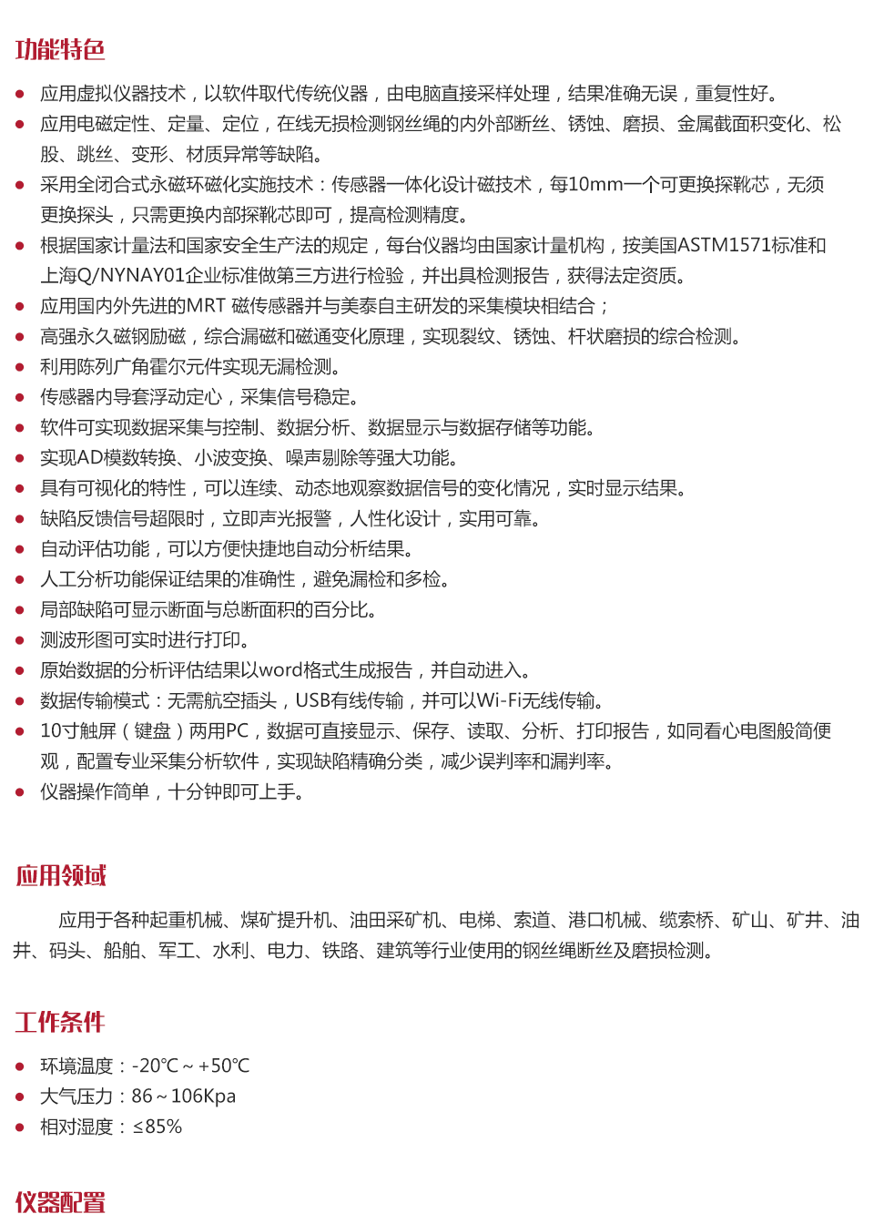 應用于各種起重機械、煤礦提升機、油田采礦機、電梯、索道、港口機械、纜索橋、礦山、礦井、油井、碼頭、船舶、軍工、水利、電力、鐵路、建筑等行業(yè)使用的鋼絲繩斷絲及磨損檢測。