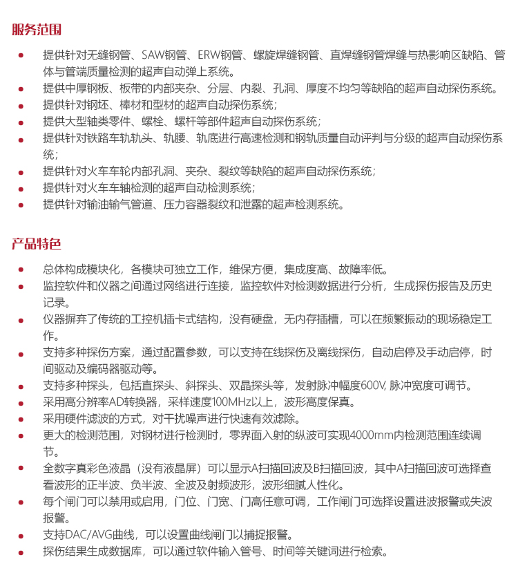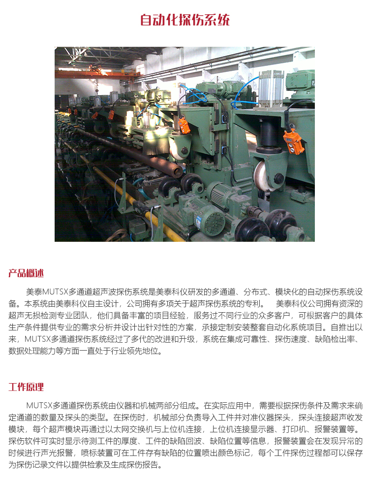 美泰MUTSX多通道超聲波探傷系統(tǒng)是美泰科儀研發(fā)的多通道、分布式、模塊化的自動探傷系統(tǒng)設備。本系統(tǒng)由美泰科儀自主設計,公司擁有多項關于超聲探傷系統(tǒng)的專利。 美泰科儀公司擁有資深的超聲無損檢測專業(yè)團隊,他們具備豐富的項目經(jīng)驗,服務過不同行業(yè)的眾多客戶,可根據(jù)客戶的具體生產(chǎn)條件提供專業(yè)的需求分析并設計出針對性的方案,承接定制安裝整套自動化系統(tǒng)項目。自推出以來,MUTSX多通道探傷系統(tǒng)經(jīng)過了多代的改進和升級,系統(tǒng)在集成可靠性、探傷速度、缺陷檢出率、數(shù)據(jù)處理能力等方面一直處于行業(yè)領先地位。