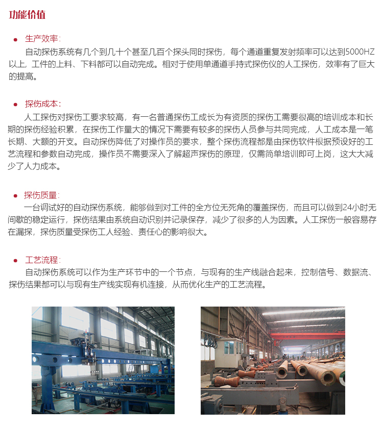 自動探傷系統(tǒng)有幾個到幾十個甚至幾百個探頭同時探傷,每個通道重復發(fā)射頻率可以達到5000HZ以上, 工件的上料、下料都可以自動完成。相對于使用單通道手持式探傷儀的人工探傷,效率有了巨大的提高。