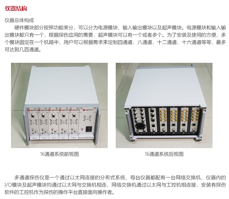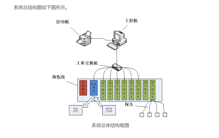 MUTSX多通道探傷系統(tǒng)由儀器和機械兩部分組成。在實際應用中,需要根據(jù)探傷條件及需求來確定通道的數(shù)量及探頭的類型。 在探傷時,機械部分負責導入工件并對準儀器探頭,探頭連接超聲收發(fā)模塊,每個超聲模塊再通過以太網(wǎng)交換機與上位機連接,上位機連接顯示器、打印機、報警裝置等。 探傷軟件可實時顯示待測工件的厚度、工件的缺陷回波、缺陷位置等信息,報警裝置會在發(fā)現(xiàn)異常的時候進行聲光報警,噴標裝置可在工件存有缺陷的位置噴出顏色標記,每個工件探傷過程都可以保存為探傷記錄文件以提供檢索及生成探傷報告。