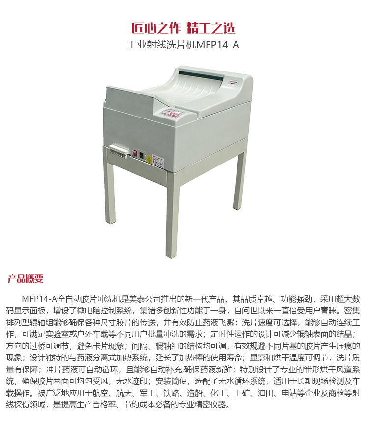 MFP14-A全自動(dòng)膠片沖洗機(jī)是美泰公司推出的新一代產(chǎn)品,其品質(zhì)卓越、功能強(qiáng)勁,采用超大數(shù)碼顯示面板,增設(shè)了微電腦控制系統(tǒng),集諸多創(chuàng)新性功能于一身,自問世以來一直倍受用戶青睞。密集排列型輥軸組能夠確保各種尺寸膠片的傳送,并有效防止藥液飛濺;洗片速度可選擇,能夠自動(dòng)連續(xù)工作,可滿足實(shí)驗(yàn)室或戶外車載等不同用戶批量沖洗的需求;定時(shí)性運(yùn)轉(zhuǎn)的設(shè)計(jì)可減少輥軸表面的結(jié)晶;方向的過橋可調(diào)節(jié),避免卡片現(xiàn)象;間隔、輥軸組的結(jié)構(gòu)均可調(diào),有效規(guī)避不同片基的膠片產(chǎn)生壓痕的現(xiàn)象;設(shè)計(jì)獨(dú)特的與藥液分離式加熱系統(tǒng),延長了加熱棒的使用壽命;顯影和烘干溫度可調(diào)節(jié),洗片質(zhì)量有保障;沖片藥液可自動(dòng)循環(huán),且能夠自動(dòng)補(bǔ)充,確保藥液保鮮;特別設(shè)計(jì)了專業(yè)的雛形烘干風(fēng)道系統(tǒng),確保膠片兩面可均勻受風(fēng),無水跡印;安裝簡便,選配了無水循環(huán)系統(tǒng),適用于長期現(xiàn)場檢測及車載操作。被廣泛地應(yīng)用于航空、航天、軍工、鐵路、造船、化工、工礦、油田、電站等企業(yè)及商檢等射線探傷領(lǐng)域,是提高生產(chǎn)合格率、節(jié)約成本必備的專業(yè)精密儀器。