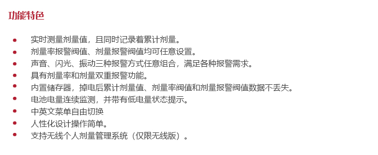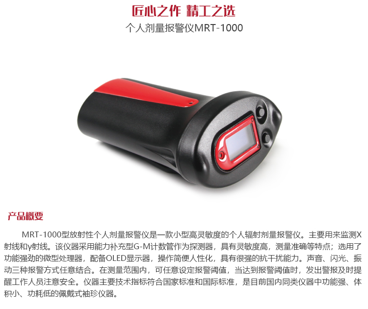 MRT-1000型放射性個(gè)人劑量報(bào)警儀是一款小型高靈敏度的個(gè)人輻射劑量報(bào)警儀。主要用于X射線和γ射線的輻射防護(hù)監(jiān)測(cè)。采用能力補(bǔ)充型G-M計(jì)數(shù)管作為探測(cè)器,具有靈敏度高,測(cè)量準(zhǔn)確等特點(diǎn);選用功能強(qiáng)勁的微型處理器,配備OLED顯示器,界面設(shè)計(jì)人性化、操作便捷,具有很強(qiáng)的抗干擾能力。聲音、閃光、振動(dòng)三種報(bào)警方式任意結(jié)合,滿足各種報(bào)警需求。在測(cè)量范圍內(nèi),可任意設(shè)定報(bào)警閾值,達(dá)到報(bào)警閾值時(shí),會(huì)發(fā)出警報(bào)以及時(shí)提醒工作人員注意安全。主要技術(shù)指標(biāo)符合國(guó)家標(biāo)準(zhǔn)和國(guó)際標(biāo)準(zhǔn),功能強(qiáng)、體積小、功耗低,是目前國(guó)內(nèi)同類儀器中佩戴式袖珍儀器的首選。