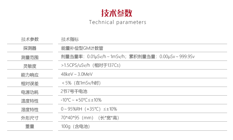 測(cè)量范圍 | 劑量當(dāng)量率:0.01μSv/h~1mSv/h;累積劑量當(dāng)量:0.00μSv~999.9Sv |