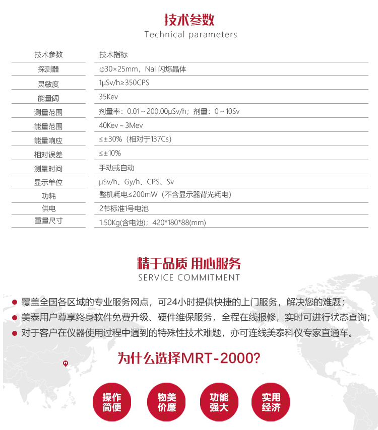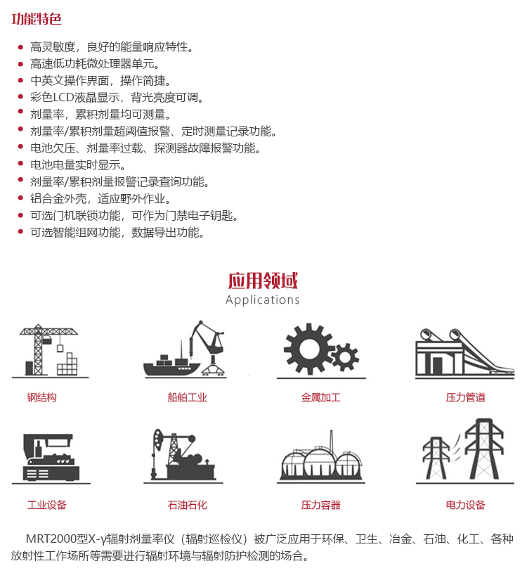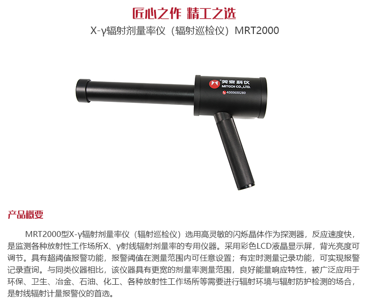 MRT2000型X-γ輻射劑量率儀(輻射巡檢儀) 選用高靈敏的閃爍晶體作為探測器,反應(yīng)速度快,是監(jiān)測各種放射性工作場所X、γ射線輻射劑量率的專用儀器。采用彩色LCD液晶顯示屏,背光亮度可調(diào)節(jié)。具有超閾值報警功能,報警閾值在測量范圍內(nèi)可任意設(shè)置;有定時測量記錄功能,可實現(xiàn)報警記錄查詢。與同類儀器相比,該儀器具有更寬的劑量率測量范圍,良好能量響應(yīng)特性,被廣泛應(yīng)用于環(huán)保、衛(wèi)生、冶金、石油、化工、各種放射性工作場所等需要進(jìn)行輻射環(huán)境與輻射防護(hù)檢測的場合,是射線輻射計量報警儀的首選。