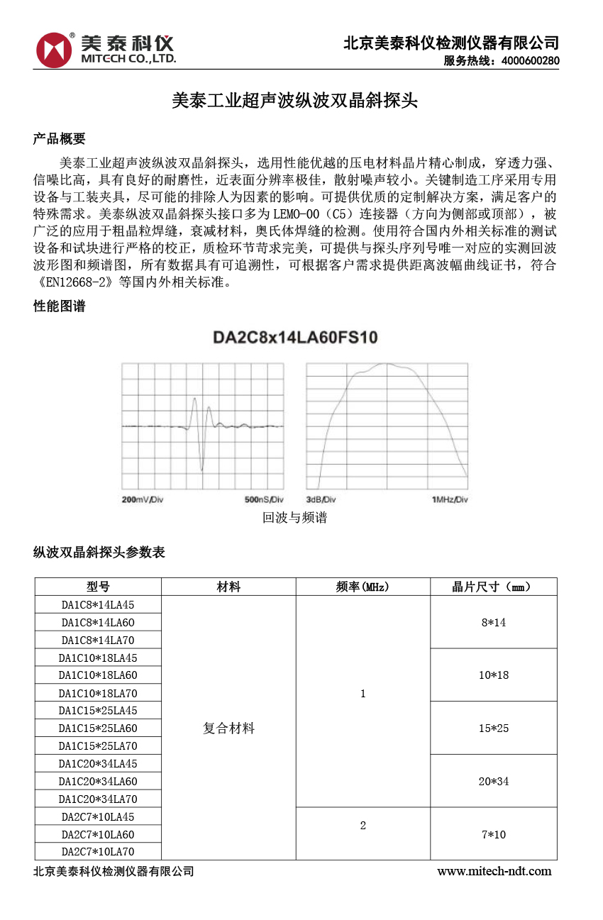 美泰工業(yè)超聲波縱波雙晶斜探頭,選用性能優(yōu)越的壓電材料晶片精心制成,穿透力強(qiáng)、信噪比高,具有良好的耐磨性,近表面分辨率極佳,散射噪聲較小。關(guān)鍵制造工序采用專用設(shè)備與工裝夾具,盡可能的排除人為因素的影響。可提供優(yōu)質(zhì)的定制解決方案,滿足客戶的特殊需求。美泰縱波雙晶斜探頭接口多為LEMO-00(C5)連接器(方向?yàn)閭?cè)部或頂部),被廣泛的應(yīng)用于粗晶粒焊縫,衰減材料,奧氏體焊縫的檢測(cè)。使用符合國(guó)內(nèi)外相關(guān)標(biāo)準(zhǔn)的測(cè)試設(shè)備和試塊進(jìn)行嚴(yán)格的校正,質(zhì)檢環(huán)節(jié)苛求完美,可提供與探頭序列號(hào)唯一對(duì)應(yīng)的實(shí)測(cè)回波波形圖和頻譜圖,所有數(shù)據(jù)具有可追溯性,可根據(jù)客戶需求提供距離波幅曲線證書(shū),符合《EN12668-2》等國(guó)內(nèi)外相關(guān)標(biāo)準(zhǔn)。