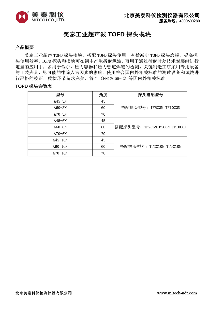 美泰工業(yè)超聲TOFD探頭楔塊,搭配TOFD探頭使用,有效減少TOFD探頭磨損,提高探頭使用效率。TOFD探頭和楔塊可在鋼中產(chǎn)生折射縱波,可用于通過衍射時差技術(shù)對裂縫進(jìn)行定量的應(yīng)用中,多用于鍋爐,壓力容器和壓力管道焊縫的檢測。關(guān)鍵制造工序采用專用設(shè)備與工裝夾具,盡可能的排除人為因素的影響。使用符合國內(nèi)外相關(guān)標(biāo)準(zhǔn)的測試設(shè)備和試塊進(jìn)行嚴(yán)格的校正,質(zhì)檢環(huán)節(jié)苛求完美,符合《EN12668-2》等國內(nèi)外相關(guān)標(biāo)準(zhǔn)。