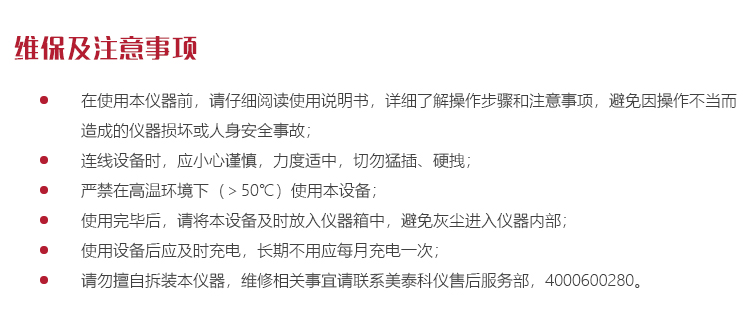 l 請勿擅自拆裝本儀器,維修相關事宜請聯(lián)系美泰科儀售后服務部,4000600280。