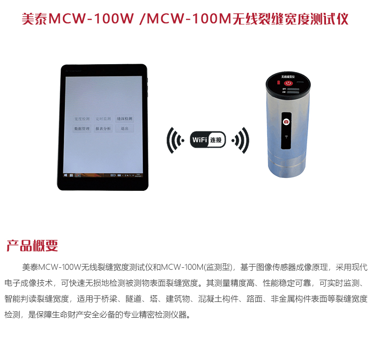 美泰MCW-100W無線裂縫寬度測試儀和MCW-100M(監(jiān)測型),基于圖像傳感器成像原理,采用現(xiàn)代電子成像技術(shù),可快速無損地檢測被測物表面裂縫寬度。其測量精度高、性能穩(wěn)定可靠,可實時監(jiān)測、智能判讀裂縫寬度,適用于橋梁、隧道、塔、建筑物、混凝土構(gòu)件、路面、非金屬構(gòu)件表面等裂縫寬度檢測,是保障生命財產(chǎn)安全必備的專業(yè)精密檢測儀器。